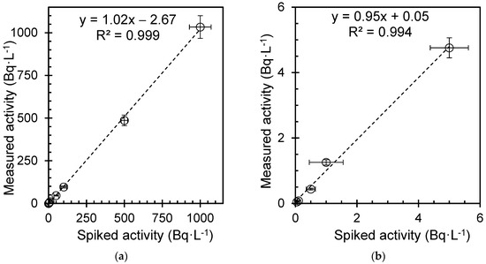 A comparison of spiked tritium activity concentration (known value) with measured tritium activity concentration using LSC and Equation 4; (a) high-activity samples and (b) low-activity samples.