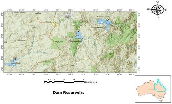 The Toowoomba region of Australia consists of three major dams, namely Cooby Dam, Cressbrook Dam and Perseverance Dam as illustrated in Figure 1. The catchments of the dams were selected as the study area as these dams serve as the main source of potable water supply for the Toowoomba region. Cooby Dam (27.3858° S, 151.9419° E) is located about 17 km north of Toowoomba on Cooby Creek, a tributary of the Condamine River. The catchment area is 159 km2 []. Cressbrook Dam (27.2638° S, 152.2080° E) is situated on Cressbrook Creek, which is approximately 10 km downstream of Perseverance Dam (27.2582° S, 152.1994° E). The total catchment area of Cressbrook Dam including Perseverance Dam is 320 km2. The storage area of Cooby, Cressbrook and Perseverance Dams is 306 ha., 517 ha. and 250 ha., respectively, and full water supply capacity is 19,703 ML, 78,847 ML and 26,893 ML, respectively []. This region has a notable amount of rainfall throughout the year. The average amount of precipitation is about 703 mm and the mean temperature is 18.1 °C []. The dam catchments in this region fall within the warm/humid climate zone of subtropical Australia []. The elevation of the catchment area of the Cressbrook Dam is between 280 m to 607 m, the Cooby Dam catchment is 482 m and the Perseverance Dam is 446.08 m from mean sea level (MSL). The topography of the dam catchments is a gentle slope at lower elevations and hills at higher elevations [].