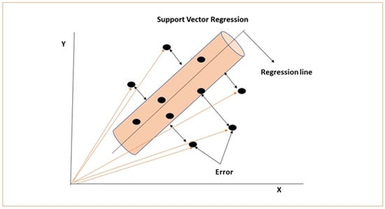 The Support Vector Machine (SVM) converts the binary classification problem into a convex optimisation problem. The basic assumption behind SVM is to create the best fit line which is a hyperplane containing the maximum number of points. The SVM can adapt to regression analysis because it provides some flexibility with errors []. In the SVR, there are two boundaries around the regression line. These boundaries are known as the epsilon insensitive tube. The function of this tube is to erect a buffer for errors. In simple terms, points within the tube indicate no error, while points outside of it are considered errors. The error is the distance of the boundary from the data points. The points outside the boundary are referred to as slack points. The vectors drawn from the origin to each of the slack points are support vectors that contribute to the formation of the tube. This is how support vector regression works []. In this study, all features were normalised to feed into the SVR. The RBF was selected as the kernel function. The process is illustrated in Figure 2.
