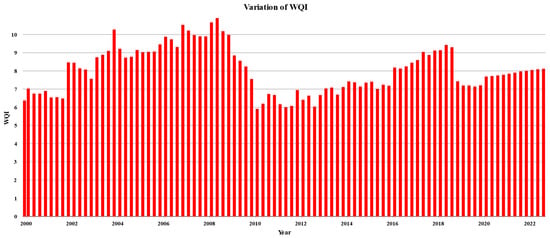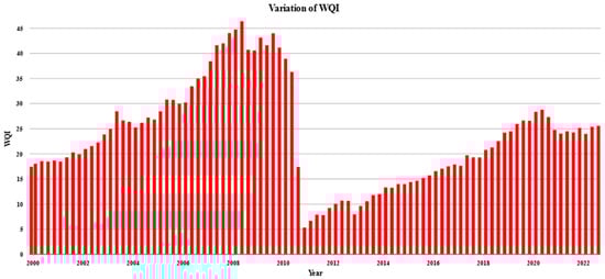 The WQI is a mathematical expression that transforms multiple water quality parameters into a single numerical value. The WQI indicates the quality of water with reference to an index number which constitutes the general quality of water for specific uses. Various formulas are developed to compute the WQI, taking into consideration design, consumption and statistical analysis []. In this study, the WQI was calculated using the weighted arithmetic mean method as per the specified formula: