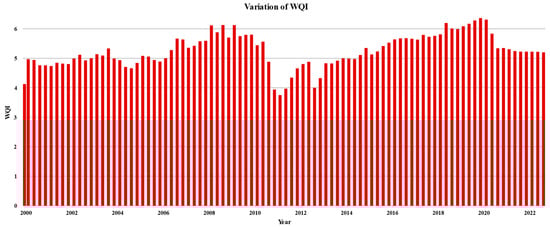 The computation outputs of the WQI range from 0 to 100 according to the National Sanitation Foundation WQI (NSF-WQI), where 100 indicates the best and 0 indicates the worst. Table 2 illustrates the different classes of water quality and their WQI range [].