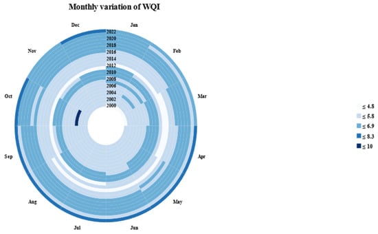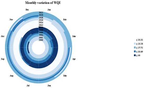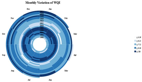 The data clock visualises the temporal trend of the WQI values by dividing the date field into rings and wedges. Each year is represented by a ring, while each month within the year is depicted by wedges. The bins in the data clock display the condensed value of the WQI for a specific period. Moving outward from the center, the temporal trend can be seen by observing the varying colours of the bin through wedges [].
