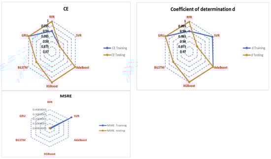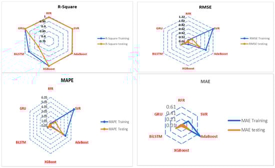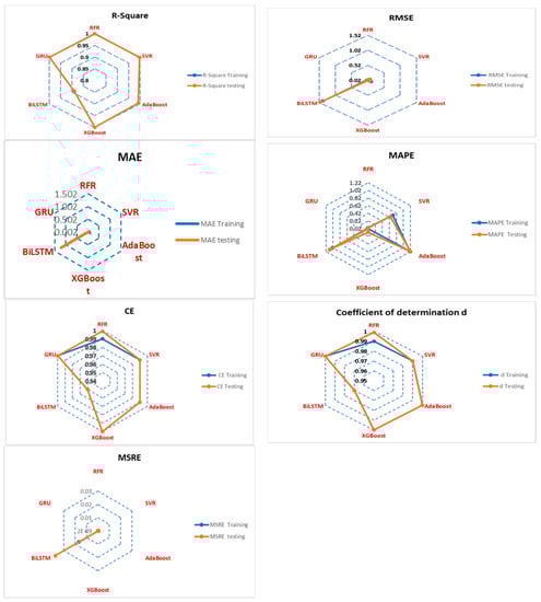- In the context of the Cressbrook Reservoir (Figure 10), the radar charts accentuate a trend that closely mirrors the Cooby Reservoir results. Once again, the models yield impressive R2 values near 0.99, underscoring their accuracy in predicting water quality.
