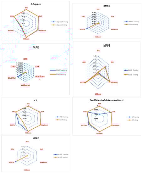The basic principle of Adaboost regression is to repeat revised data to fit a sequence of weak models. Specifically, the Adaboost regressor starts by connecting a regressor on the primary dataset and then it continues to work on the same dataset by adding supplementary regressors to correct the errors in the ongoing predictions. This conversion of data by assigning weight at each level is called boosting iterations. All predictions are combined through a weighted majority vote to generate the final prediction. For the weak learners who predicted incorrectly at the initial stage, their weights are increased, and, conversely, weights are decreased for those that made correct predictions. By successive iterations, each weak learner focuses on the missing examples by the antecedent ones in the series []. In the present study, default values are used, including a number of trees set to 100, a maximum depth set to 5 and a learning rate set to 0.1.