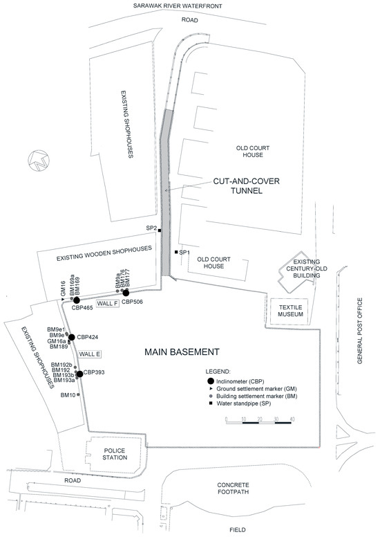 The site layout plan and the geotechnical monitoring instruments (i.e., in-pile inclinometers, building and ground settlement markers, and water standpipes) are shown Figure 1. The length of each inclinometer was about 20 m, providing an extension of 6 m beyond the pile toe to capture any potential toe movement [21]. In this case study, Wall E comprised CBP393 and CBP 424, while Wall F comprised CBP465 and CBP506.