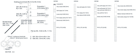 The upper layer of the geology consisted of loose sand or soft-to-firm clayey silt, as shown in Figure 2, for the piles of interest, namely, CBPs 393, 424, 465, and 506. The standard penetration test (SPT) ‘N’, particle content, water content, plastic limit, and liquid limit are presented in Figure 3. The site was characterized by ‘N’ values ranging between 1 and 15 for the upper 5 m of soil layers. For the next 5 to 7 m, the ‘N’ value ranges from 15 to 50. High sand contents were observed in Figure 3, ranging from 60% to 90% for the first 6 m. Highly weathered metamorphic phyllite was found starting at depths of approximately 6 to 8 m below the existing ground level, with the occasional presence of metasandstone, enabling the bored piles to be consistently socketed into the phyllite bedrock.