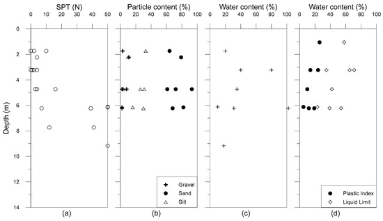 Geological properties obtained from borehole logs: (a) SPT ‘N’; (b) particle content; (c) water content; (d) plastic limit and liquid limit.
