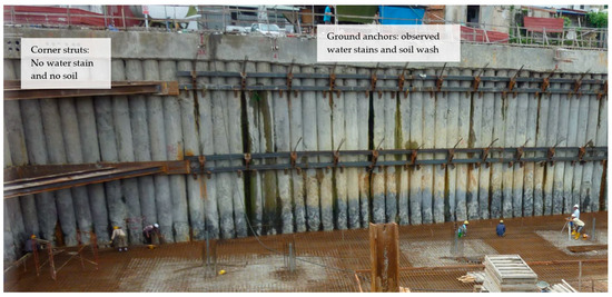 The observed settlements were perhaps caused by the combination of [22] (i) some losses of soil particles that may have been washed out during the ground anchor installation using the rotary wash drilling method and (ii) the groundwater loss from the CBP wall ground anchor installation works before the grout of the anchor cured. During construction, care was taken to minimize these effects, where non-shrink concrete was used to increase the curing rate of the grout. Although the possibilities of having construction defects are present, failures associated with it are higher for excavation depths of more than 20 m [25]. The ground anchors were spaced at an interval of 2.25 m that corresponded to the cement grout column (CGC) locations. Therefore, the ground anchor installation process involved coring through the grout columns, thus effectively causing leakages in the CBP wall system. Wiggan et al. [10], Powrie et al. [11], and Clough and O’Rourke [26] all identified that through-the-wall seepage can be one of the main causes of adjacent ground settlements. Site observations revealed that, on the ground anchor installation works, the groundwater would immediately seep through the ground anchor holes, as evidenced from Figure 4, where the walls retained by the ground anchors showed distinct water stain marks beneath the ground anchor heads. In contrast, corner wall sections retained by the corner steel H-section struts were dry. The water stain marks were observed to occur at both GA1 and GA2 levels due to the existing high groundwater table.