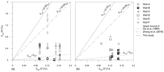 Relationship between (a) maximum building settlement and maximum wall deflection; and (b) ground settlement and maximum wall deflection, due to the likely cause of accidental groundwater lowering during the ground anchor installation process. Upper bound after Ou et al. (1993) [27] and Zhang et al. (2018) [28].
