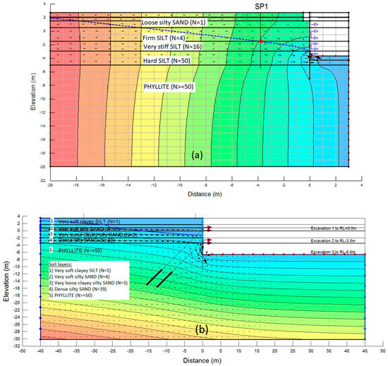The soil model chosen for the analysis was the linear elastic–perfectly plastic, commonly known as Mohr–Coulomb (MC), model due to the limited presence of clay. Furthermore, soil movements are very much dependent on soil stiffness instead of the soil model [11]. Any numerical model is always affected by model uncertainties [30]. The soil properties for both wall sections are summarized in Table 2. For soils with ‘N’ from 0–3, the soil modulus (E′) of 5217 kN/m2 was adopted, while the modulus for soils with ‘N’ > 3 were estimated using Equations (1) and (2) [31]. For the geologically complex phyllite layer of the Tuang Formation in Kuching city, E′ of 250,000 kN/m2 was used [22,32]. As an undisturbed mass block under confining pressure, phyllite exhibited high strength despite its rock quality designation being less than 25% upon coring and retrieval [32].