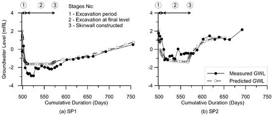 Figure 10a,b shows the two methods of modeling the equivalent wall permeability situations, where the former considers the case of a ‘permeable wall’ with 50 mm gaps between successive bored piles towards the eastern corner of Wall F (without grout columns) while the latter considers the case of ‘impermeable wall’ but with leakage points at the ground anchor heads at Wall E and most parts of Wall F. It is evident from Figure 10a that the phreatic level at the Standpipe SP1 location compared really well with the field-measured groundwater level (shown with a red dot), thus reflecting the reliability of the hydrogeological parameters used. This observation was also consistent with the flowtank tests [10] that showed the groundwater table immediately behind the wall went from near vertical to near horizontal, when groundwater was allowed to be discharged via the equivalent permeable wall. Using this modeling technique, a good match was observed between the measured groundwater profiles (SP1 and SP2) and those predicted from SEEP/W over a period of more than 200 days, as evidently shown in Figure 11a,b, respectively. Figure 11a,b also shows that, upon excavation, the groundwater drawdown was immediate and remained close to the final excavation level when the construction of the skinwall was on-going after the excavation process. After the skinwall was finally constructed, it effectively cut off the groundwater flow through the wall, thus re-establishing the groundwater to its original level, as shown in Figure 11a,b.