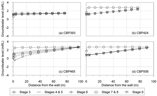 SEEP/W predicted groundwater levels at the main basement excavation using equivalent permeability technique for (a) CBP465, (b) CBP506, (c) CBP465, and (d) CBP506.