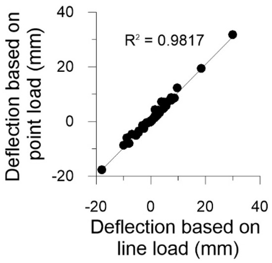 The capping beam is an important consideration, especially during the cantilever stage of the excavation, as it provides the necessary restraint for the individual bored pile tops to act in unison. In the 2D analysis, the capping beam was simulated by applying a horizontal load at the top of the wall. Due to the capping beam thickness of 1.35 m, the modeling technique of how to represent the capping beam was tested by adopting either a ‘line load’ (kN per m length of the wall) or ‘point load’ (kN), as shown in Figure 14. The results from the modeled wall sections at various profile heights show good comparisons between the two techniques with R2 = 0.9817 (Figure 15). This means that both modeling methods were acceptable since they provided rather similar results in the 2D environment. For consistency, the line load technique was adopted so that the height of the capping beam could be properly modeled.