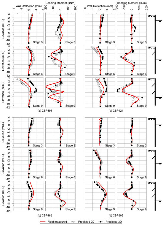 The corresponding measured pile bending moment profiles for CBPs 343, 424, 465, and 506 can be obtained by performing double-differentiation on the respective deflection profiles to yield their respective curvature profiles [16]. If the respective curvature profile is divided by the known pile bending rigidity (EI) value, then bending moment is obtained [14,16]. It can be seen from Figure 17a–d that the predicted bending moment profiles from the 2D and 3D analyses are rather similar in shape and profiles to their corresponding calculated counterparts obtained via the measured pile deflection profiles. Similarly, as the calculated bending moment magnitudes were derived from the measured pile deflection profiles as discussed above, any variations in the pile deflection profiles would be correspondingly reflected in the subsequent pile bending moment profiles [14,16]; hence, consistent discrepancies were observed between both the measured and predicted magnitudes for all Stages 3, 6, and 9. Nonetheless, the observed small discrepancies in magnitude are insignificant to raise any further concerns. It is more important that the pile response profiles or shapes are correctly predicted in order to articulate the more complex pile–soil interaction behaviors [14,49], which are discussed next.