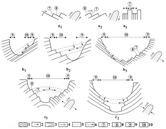Cuestas and glacier valley cross-sections [9] (modified). 1. Beds, 2. direction of bed dipping, 3. glacier in plan view, 4. direction of glacier movement, 5. former bed unit, former fracture, 6. water percolation, 7. scarp front, 8. exposed bedding plane, 9. steep valley slope with cliffs, 10. gentler valley slope and valley floor with steps; (a). valley developed in dip direction, (a1). direction of ice movement was identical to the dip direction of beds, (a2). direction of ice movement was opposite to the dip direction of beds, (a3). the beds are vertical, (b1). the valley is of strike direction, asymmetric valley cross-section, on one side of the valley the exposed bedding planes dip towards the center of the valley, (b2). the valley is of strike direction, asymmetric valley cross-section, on one side of the valley, the exposed bedding planes dip towards the margin of the valley, (b3). the valley is of strike direction, asymmetric valley cross-section, on one of the valley slopes, the exposed bedding planes dip towards the center of the valley, while on the other valley slope, they dip towards the margin of the valley, (c1). valley developed on an anticline, (c2). valley developed on a syncline.