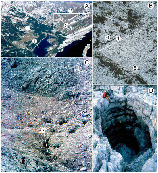 Some features of glaciokarst: (A) Giant drawdown dolina, Skryke (Durmitor, Montenegro, photo by Veress), (B) bedding plane surface with rinnenkarren (Totes Gebirge, Austria, photo by Veress), (C) giant drawdown doline, with subsidence dolines on its floor (Julian-Alps, Slovenia, photo by Veress), (D) shaft (Totes Gebirge, photo by Veress). Legend: 1. Rock basin, 2. debris slope, 3. margin of partial doline covered with debris, 4. surface with bedding planes, 5. cuesta, 6. giant grike, 7. subsidence dolines.