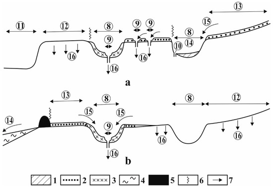 Theoretical turnover of a trough: (a). Hanging trough, (b). trough with terminal moraine (karstic depressions develop in the total width of the floor); 1. impermeable cover, 2. basal moraine (permeable), 3. reworked, permeable cover, 4. fluvioglacial sediment, 5. terminal moraine, 6. barrier of material transport, 7. material transport, 8. giant solution doline, 9. subsidence doline, 10. ponor, 11. main valley, 12. bare karst, 13. concealed karst, 14. allogenic karst, 15. water transport from the cover (suspended, rolled, in solution), 16. material transport into the karst.