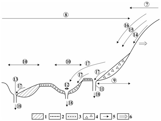 Theoretical turnover of a cirque (karstic depressions are not aligned along the profile): 1. Impermeable cover, 2. basal moraine, 3. reworked permeable moraine, 4. debris (material of frost weathering and avalanches), 5. material transport (water transport and in solution) into the karst, 6. retreat of the cirque slope, 7. combe-ridge, 8. cirque floor, 9. debris cone, 10. giant solution doline, 11. shaft, 12. subsidence doline, 13. ponor, 14. material transport from the rock wall by stream (suspended and in solution), 15. material transport by avalanches, 16. debris fall and collapse, 17. water transport from the cover (suspended, rolled, in solution), 18. material transport into the karst.
