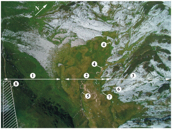 Aerial photograph of area IV under Wildgössl (cirque formed from paleouvala, Totes Gebirge): 1. Side of paleouvala with debris fans, 2. floor of paleouvala with superficial deposit, 3. slope of paleouvala with glacially eroded cuesta, 4. ponor, 5. gully, 6. covered karst terrain intruding into the depression of the cuesta, 7. a subsidence doline in the zone of thin superficial deposit next to rock boundary, 8. zone of springs.