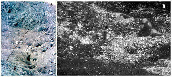 Suffosion dolines receiving till: (A) Suffosion dolines in the debris of a paleouvala (Julian Alps, near Triglav, Slovenia), (B) suffosion dolines from the floor of a glacial valley (Totes Gebirge, Austria). Legend: 1. Suffosion doline, 2. paleodoline.