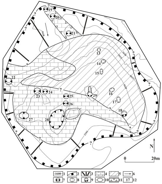 Geomorphological map of the DSD (exposing paleodoline) of Hochschwab [1]: 1. Contour line, 2., spring (permanent and intermittent), 3. stream, 4. lake, 5. waterlogged area, 6. col, 7. exposed limestone, 8. slide, 9. roche moutonnée or karstic residual feature, 10. edge of the DSD, 11. mound on the margin of the depression system, 12. limestone ridge, 13. denuded side slope of the depression, 14. accumulational slide slope of depression, 15. cryptokarstic part of the depression floor, 16. concealed karstic part of the depression floor, 17. nivation and mass movement features of the side slope, 18. slide (with mass movement), 19. thufur field, 20. infilled ponor, 21. active ponor, 22. recent uvala, 23. solution doline, 24. shaft, 25. rain furrow, 26. gully, 27. channel on valley floor, 28. valley, 29. tourist track.