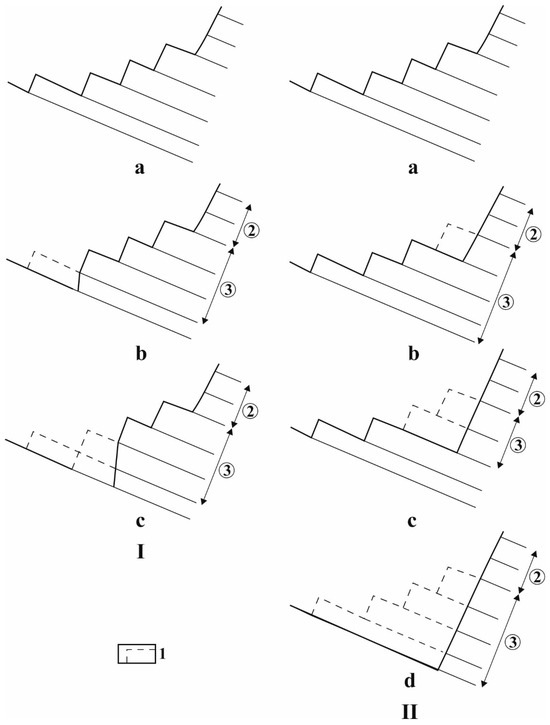 Geomorphic evolution (peeling) if the beds are inclined towards the margin of the slope, but the peeling of beds with lower position (I) or with upper position is faster (II) [1]: 1. Destroyed bed unit, 2. slope formed by glacial erosion, 3. slope formed by the peeling of the bed, (a). stepped surface, (Ia–IIa). original state, (Ib–Ic). beds are destroyed at lower steps, during this a widening bedding plane and a high scarp front develop, (IIb–IIc). the beds of upper steps are peeled more intensively, by which wider and wider bedding planes are exposed, (IId). only one bedding plane surface develops under the former stepped surface.