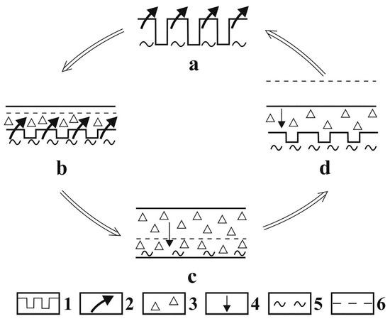 Denudation cycle with karren formation [1]: 1. Grike, 2. formation of karren debris, 3. karren debris, 4. the material of the debris is transported away in solution, 5. saturation level, 6. original surface, (a). grike development, (b). formation of karren debris (the surface is a bit elevated), (c). the debris thickens out, the saturation level is located on the bedrock surface, (d). the debris becomes thinner since its material is transported away in solution, the saturation level is situated in the bedrock, a newer generation of grikes develops, then a newer karren denudation cycle begins with the using up of debris.