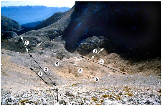 Covered karst features of the cirque below Triglav (Julian Alps): 1. counter-slope scarp (roche moutonnée), 2. covered karst in cirque, 3. debris fan of the cirque, 4. debris-covered giant grike with rows of subsidence dolines, 5. shafts, 6. subsidence dolines.