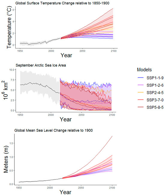 GMSL, Global Surface Temperature Changes (GSTC) relative to 1850–1900, and the September Arctic Sea Ice Area (SASIA) are depicted in Figure 1. GMSL has risen between 16 and 21 cm within the last century [1,2] and will likely accelerate in the future. For example, projections by the IPCC depicted in Figure 1 indicate that the global mean sea level may increase up to 1 m by 2100 [3,4,5]. The projections represent five different scenarios of Shared Socio-economic Pathways (SSPs) based on four factors including sustainable development, regional competition, inequality, and fossil-fuel consumption [4].