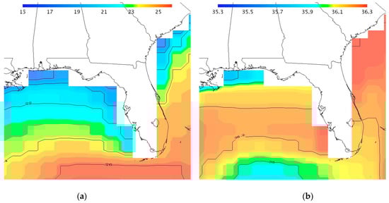 Two environmental factors, water temperature and salinity (Practical Salinity Units, PSU), were obtained from the Estimating the Circulation and Climate of the Ocean (ECCO) Version 4 Release 4 (R4) providing the latest ocean state estimate product [31,32,33]. The simulations were performed using the Massachusetts Institute of Technology general circulation model (MITgcm). When available, the model output has been fit to in situ and satellite observations (sea level, sea ice, temperature/salinity profiles, SST, dynamic topography) using linear regression [34]. The gridded output is available at depth (50 levels) to about 6000 m. However, only the uppermost model level (5 m depth) is used here. Temperature and salinity are important as they impact both sea level and ocean circulation. The horizontal resolution varies spatially from 22 to 110 km, with the resolution increasing in high latitudes. The ECCO temperature and salinity data depict variability along the Florida coastline (Figure 4).