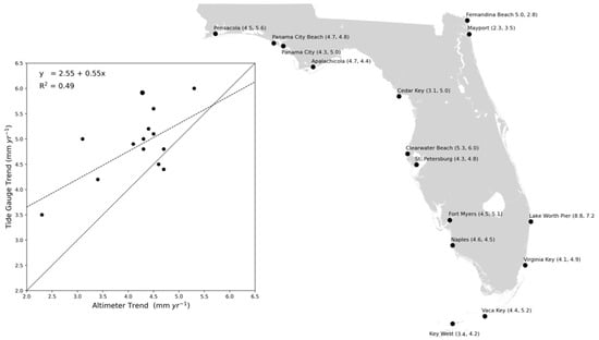 (Left) Corresponding scatter plot of tide gauge measures regarding altimeter values (black disks) with superimposed linear regression of the trends (dashed line) in comparison with perfect one-to-one match (solid line). (Right) Tide gauge locations used in this study. The SLR trends (1993–2019) for both the altimeter and tide gauge (respectively) are shown in parentheses.
