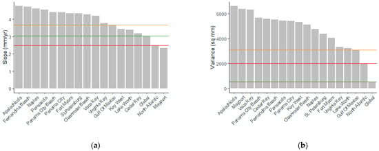 Sea surface height anomaly rate of change (trend) in mm/yr (a) and variance mm2 (b) across the 15 selected Florida locations, as compared to the Gulf of Mexico (green line), North Atlantic Ocean (orange line), and global mean sea level (red line).