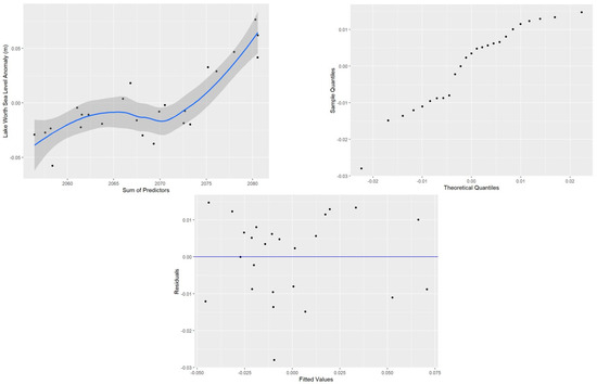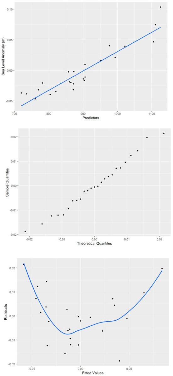 (Top) Fitted multiple regression model (blue) for the sea level rise at Pensacola in Florida; (Middle) Normal Q—Q Plot; (Bottom) and heteroscedasticity of the sea level data (residuals vs. fitted values).