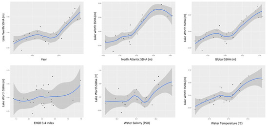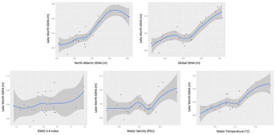Predicted sea level trends using the SLR-M2 GAM vs. individual predictors at Lake Worth, FL. Predicted values using GAM (black dots) and smoothed trends obtained using loess (blue lines) along with the associated confidence intervals (gray shading). Predictors starting from top left and moving in clockwise direction are North Atlantic (regional) SSHA (m), global SSHA (m), water temperature (°C), water salinity (PSU), and ENSO 3.4 Index.