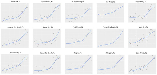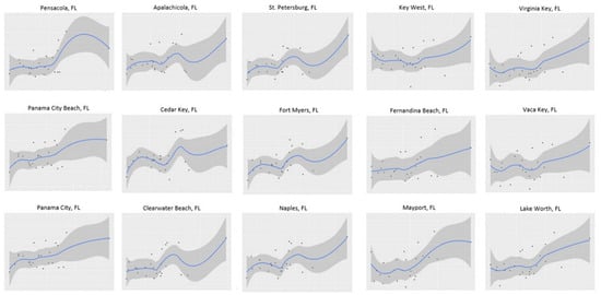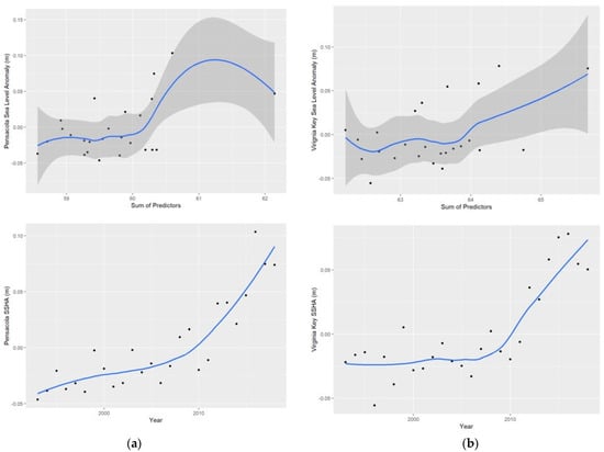Figure 13 shows a comparison between the SLR-M2 GAM predicted SSHA and the observed SSHA plotted as a function of time. For some of the locations, such as Pensacola, FL in Figure 13a, the trend was very different for each of these two plots. This validates the fact that the increasing/decreasing trends of SSHA are due to predictors other than year in the SLR-M2 GAM. For other locations, such as Virginia Key, FL in Figure 13b, the trends for both plots were similar. This shows that sea level increases due to the other predictors having a similar pattern to sea level rise over time.