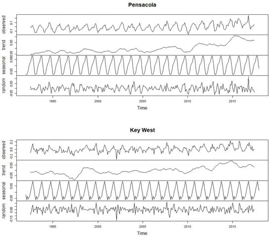 Decomposition of altimetry data for Pensacola, FL (top), Key West, FL (middle), and Corpus Christi, TX (bottom).
