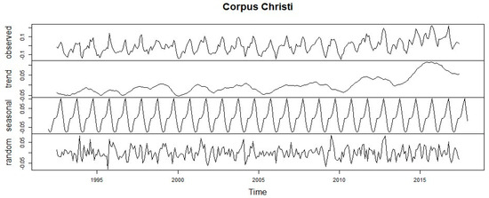 While global estimates for sea level rise provide a general trend that can be used in planning and policy making [4], local estimates would provide more accurate estimates to prepare and plan. Additionally, there is a noticeable jump in the trend across all Florida locations in 2011 (Figure 14) that is not present in other nearby geographical locations (for example, Corpus Christi, TX, Figure 15 (bottom)). Due to its relative recency, this jump has not been extensively covered by previous climate change reports in the region. Further investigation of the sea level change in this period in the Florida region would be helpful for understanding additional factors that could lead to rising sea levels in the state and would contribute to the body of knowledge on sea level rise in the general southeastern region of the United States.