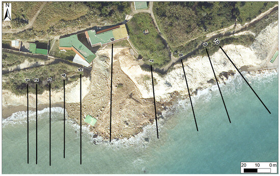 The satellite images were georeferenced by means of GIS software based on the Topographic Map (1:5000), using fixed reference points (e.g., buildings and crossroads). Successively, the cliff perimeter and the beach limits were digitised for each year on the available orthophotos, satellite images, and topographic maps, enabling the analysis of their temporal evolution and the assessment of coastal retreat (i.e., sea cliff-orthogonal translation from its initial position). The shoreline position was identified as the water line at the time of the individual images since the study area is located in a microtidal environment [38,39]. The progradation/regression trends of the cliff and beach edges were quantified by measuring their variation in sequential images. These values were collected along 10 measurement lines (transect, T) perpendicularly arranged with respect to the cliff and the beach (Figure 3).