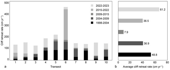 Cliff retreat rate (cm yr−1) measured on the 10 measurement lines at different time intervals. (a) Cumulative cliff retreat rate for each transect through the time; (b) average cliff retreat rate for each time interval.