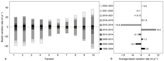 Beach width variation rate (m yr−1) measured on the 10 measurement lines at different time intervals. (a) Cumulative beach width variation rate for each transect through the time; (b) average beach width variation rate for each time interval. The positive values indicate progradation, and the negative values indicate regression.