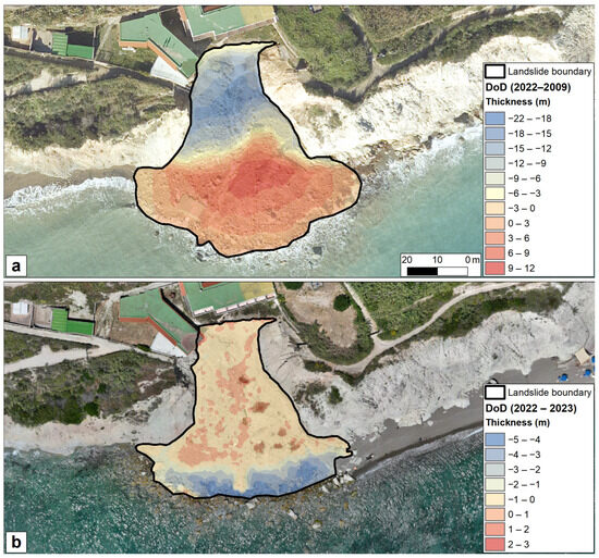 Orthophotos of the November 2022 landslide area with the landslide perimeter and the results of the DoD analyses between (a) 2009–2022 and (b) 2022–2023 DEMs.