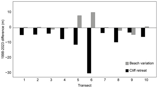 The evolution of the beach width showed an alternation of regression and progradation trends. In detail, the regression trends (the negative parts of the chart in Figure 5) can be correlated with the cliff retreat trends (Figure 4). In fact, the areas where the highest cliff retreat rates were registered (T4–T6) showed lower beach regression rates with respect to the other transects. The trends of beach regression and progradation showed low or no correlation with the cliff retreat rate, with the increase/decrease of beach width alternating independently of the cliff.