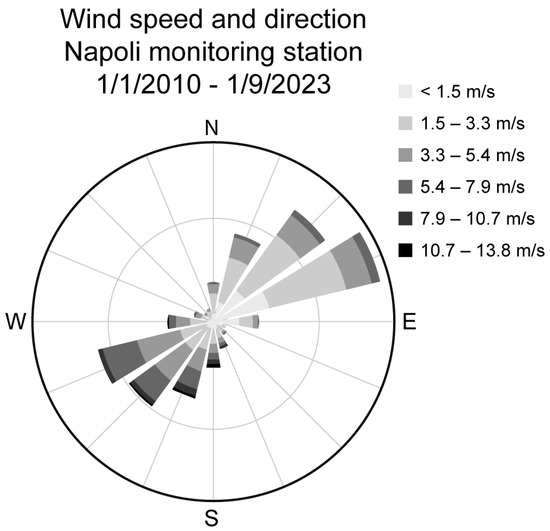 Wind direction and intensity recorded at Napoli monitoring station in the 2010–2023 time interval (ISPRA).