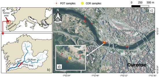Geographic map displaying the surveyed river reach, delineating sampling points: (a) the survey area in the European context, (b) the sampling site in the Miño River watershed, (c) detail of the study site and its urban surroundings, (d) zoom of the COR sampling site. Orthophoto sourced from PNOA (Instituto Geográfico Nacional de España, ©IGN), with reference vector layers from HydroRIVERS [] and HydroBASINS [].
