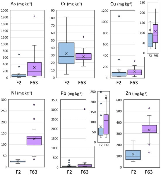 The box and whisker plots depict the distribution of data for the six target elements analyzed in the study, categorized by the particle-size fraction: <2 mm (F2) and <0.063 mm (F63). Additional boxes for Cu and Pb represent zoomed-in sections. The plot provides insights into the variability and central tendencies of the element contents within each fraction.