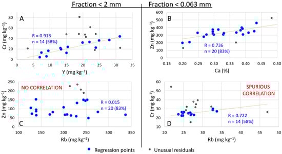 Figure 3 illustrates graphical representations of selected examples from the iterative least squares correlation outputs. The complete analysis, along with the database, has been included as supplementary material. It is crucial to exercise caution when employing this approach for background estimation, as highlighted in previous research []. Specifically, Figure 3D provides a clear example, where the correlation between Cr (dependent variable) and Rb (independent variable) displays a respectable correlation coefficient of 0.722 and a reasonable number of samples (14, equivalent to 58% of the dataset). However, the distribution depicted in the plot exhibits characteristics that could be interpreted as bi-modal or indicative of the summation of two distinct populations. Consequently, this observation raises questions about the validity of using least squares regression, which assumes data normality. The resulting background functions derived from this methodology are detailed in Table 2.