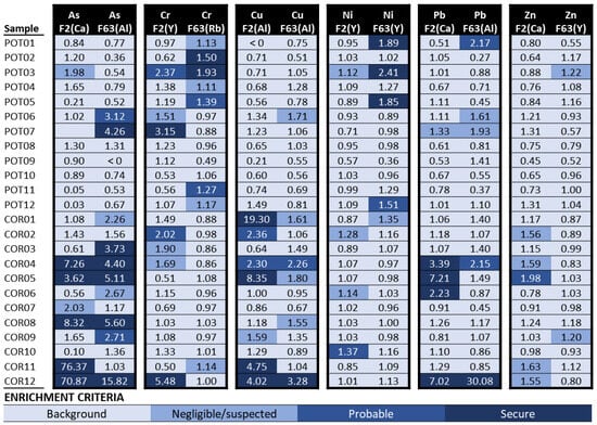 The samples were commissioned to the Center for Scientific-Technological Research Support (CACTI-UVigo), an ISO 9001-certified laboratory [], for compositional analysis. The <2 mm fraction was analyzed using X-ray fluorescence, while the <0.063 mm fraction, due to its limited quantity, underwent analysis using optical emission inductively coupled plasma spectrometry (ICP-OES). The chosen target elements for the analysis included As, Cr, Cu, Ni, Pb, and Zn, as these elements are commonly associated with human activities. Additionally, Al, Ca, Fe, Rb, and Y were selected as reference elements. Aluminum and Fe were chosen as reference elements due to their widespread use []. Rb was recommended as a reference element for sediment normalization by []. Calcium was selected to represent minor constituents in source rocks, and Y was chosen based on its demonstrated effectiveness in previous studies involving the normalization of rare earth elements in the region []. However, an initial assessment of the data raised concerns regarding a significant non-natural enrichment of Fe, particularly in the core sediments within a pothole (up to 12% in the COR12 sample). Additionally, during the sampling process, the presence of red coloring attributed to iron-debris, i.e., construction and demolition waste dumped in the river in the past, was evident at the base of the cavity, indicating oxidation. Consequently, Fe was excluded as a reference element due to its potential to violate the requirement that reference elements should not be significantly affected by human sources [].