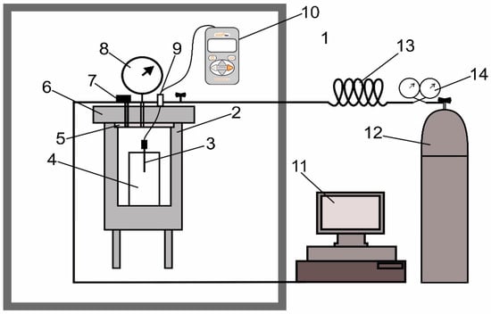 A sketch of the system for measuring the thermal conductivity of pressurized samples: 1 = climatic cell; 2 = pressure cell; 3 = thermal conductivity and heat capacity sensors; 4 = container with samples; 5 = Teflon gaskets; 6 = steel lid; 7 = pressure sensor; 8 = digital pressure gauge; 9 = connector of thermal conductivity sensor; 10 = KD-2 Pro needle probe; 11 = PC with ADC; 12 = gas bomb; 13 = gas tube; 14 = pressure regulator.