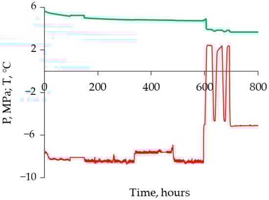Time-dependent behavior of temperature (red line) and pressure (green line) in frozen hydrate-bearing sand exposed to hydrate formation.
