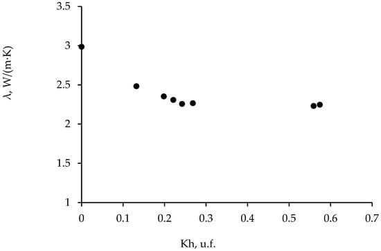 The performed modeling confirms that the thermal conductivity of frozen sand is lower in the presence of pore gas hydrate in the soil system, while more thermally conductive pore ice has lower percentages. The behavior of thermal conductivity depends on the fraction of pore ice converted to hydrate (hydrate coefficient, ), as shown in Figure 3.